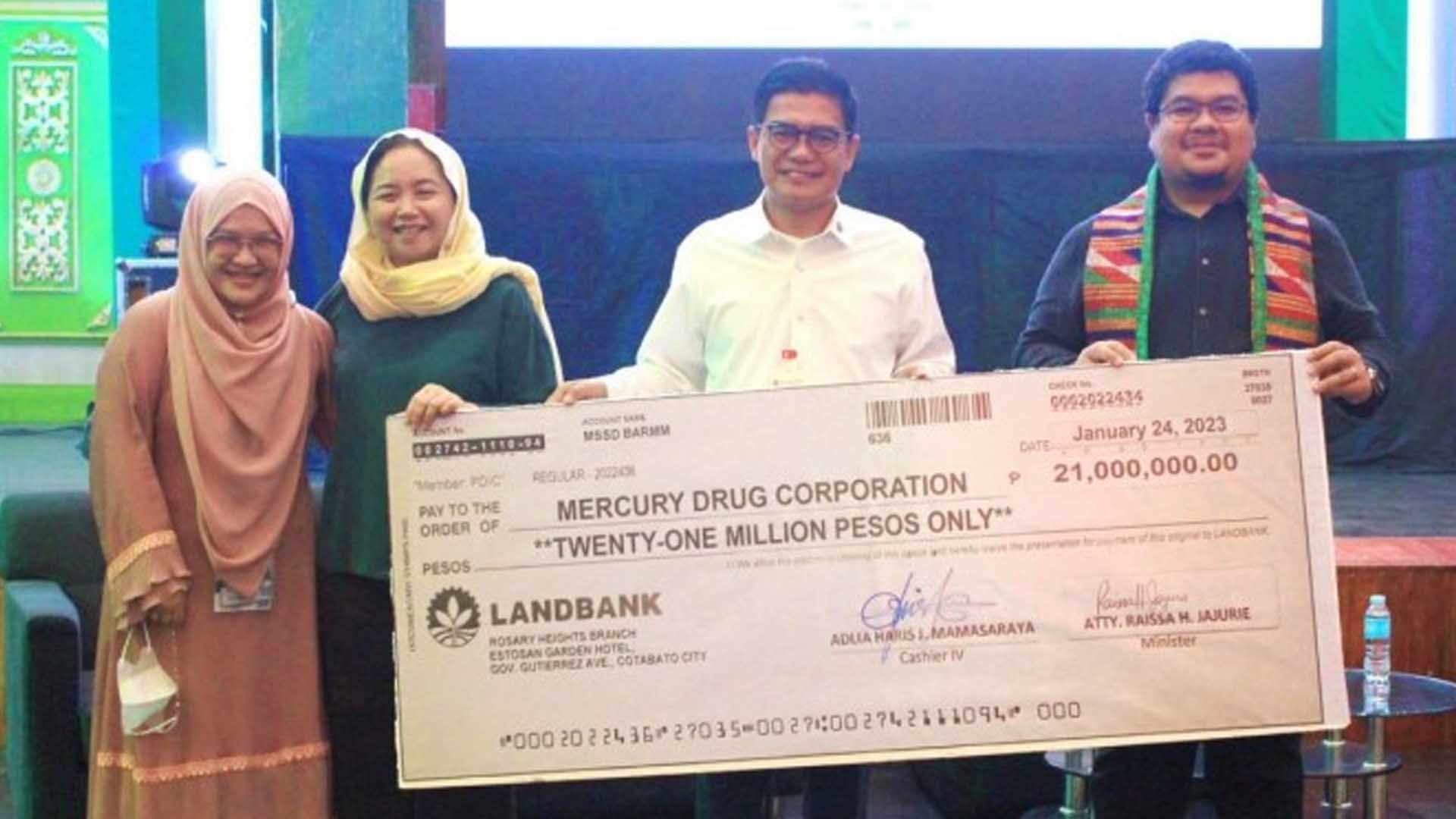 This came after lawyer Raissa Jajurie, MSSD minister, issued a check worth PHP21 million Thursday to Mercury Drug Cotabato branch manager Daniel Ulep to facilitate the provision of medicines for indigent patients.